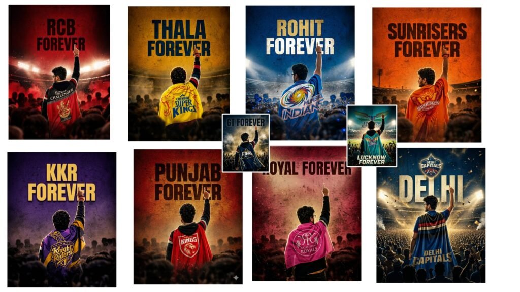 Rcb prompt A Uploaded image create dramatic sports poster of a passionate cricket fan standing same dress in a huge …