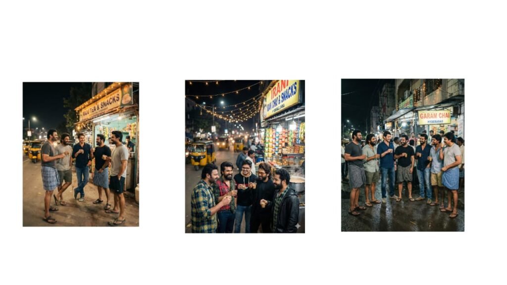 Prompt 1 A generate uploaded. lively night-time street scene in India, featuring five cheerful men standing together outside a small …
